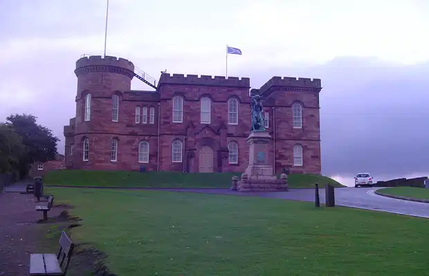 Inverness is one of the major cities in the North of Scotland, close to the massive Highlands. In the heart of the city, overlooking the River Ness, stands the castle which dates from 1836 and was built by William Burn on the location in the old fort to defend the city. Made entirely of pink stone, it consists of several watchtowers with crenelated parapets. A small park allows visitors to enjoy a view of the city and river below.