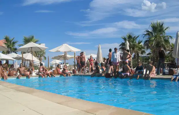 From 5pm this beach front premises in Pampelone opens its doors with an atmosphere of luxury and glamor. Where a glass of champagne costs 25 €, the bottle on the sofa costs € 350. Reserved VIP in the pool. Good music and there's a shop service onsite. A fantastic experience!