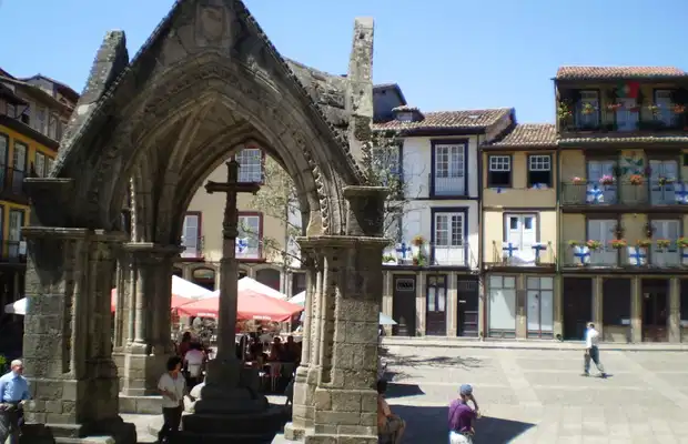 Directly in front of the Church of Our Lady of Oliveira in the Largo da Oliveira, is this memorial to the victory of the Battle of Salado in 1340, when Portuguese and Spanish troops fought benimerines from North Africa who tried to invade the Iberian Peninsula. It's a kind of Gothic temple with a cross inside and was built by Afonso IV in the fourteenth century.