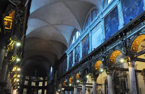 Santa Maria del Carmelo (or Carmini) church is in the Dorsoduro district and was built in the fourteenth century - but has been altered since. Its most notable feature is an elegant campanile, whose inclination was rectified in 1688. The interior is very bleak but carefully decorated, the nave arches are decorated with wooden statues and a series of paintings illustrating Carmelite order history. There are 2 interesting paintings in the side altars, one of Conegliano and another of Lorenzo Lotto. Beside him stands the big school of "Carmini" where Tiepolo decorated the entire ceiling of the room